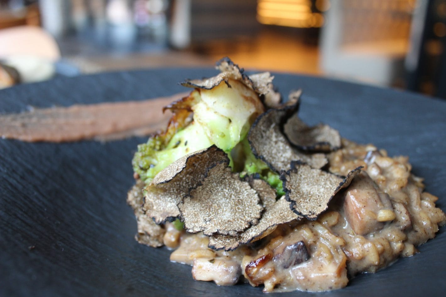 Then he sautéed the mushroom risotto, and at this point, all of the components were ready, so he assembled this fantastic dish. As the last touch (and for me, the best part), Kevan began slicing the summer black truffle in a very delicate lamination.