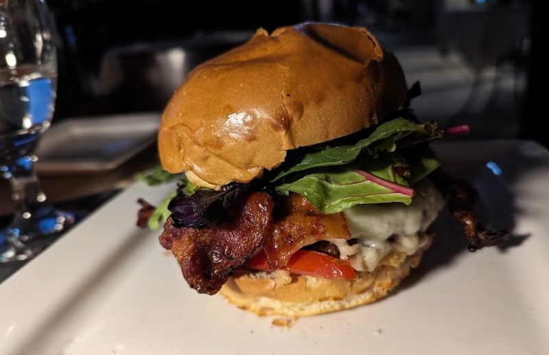 Another top pick is the Seared Burger with a Balsamic Glaze, Lemon Aioli, Bacon, Sliced Tomato, Spring Mix, Cheese, all on a Toasted Garlic Brioche Bun. It’s made with high-quality meat that’s cooked just right—so juicy and packed with flavor, I highly recommend it!